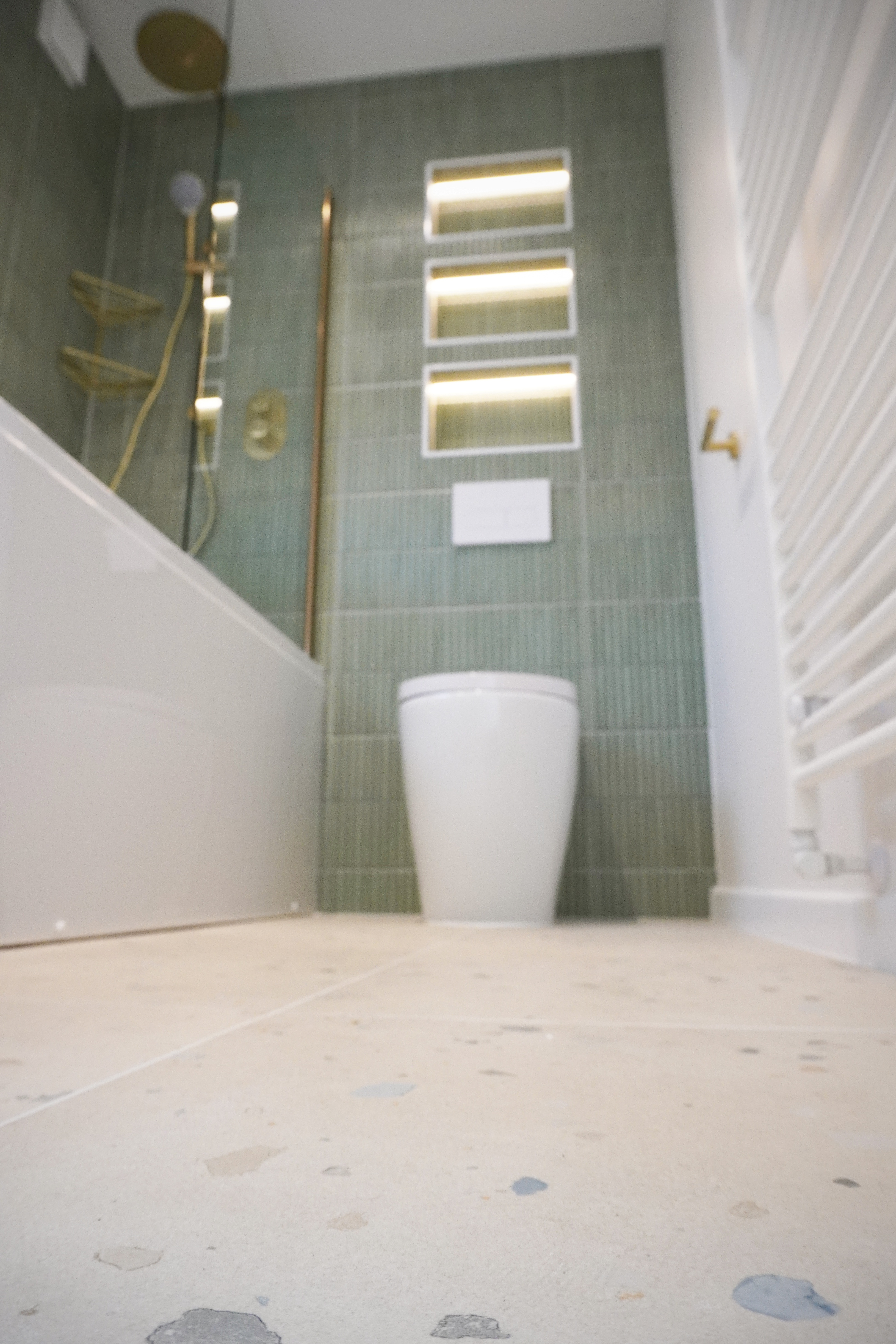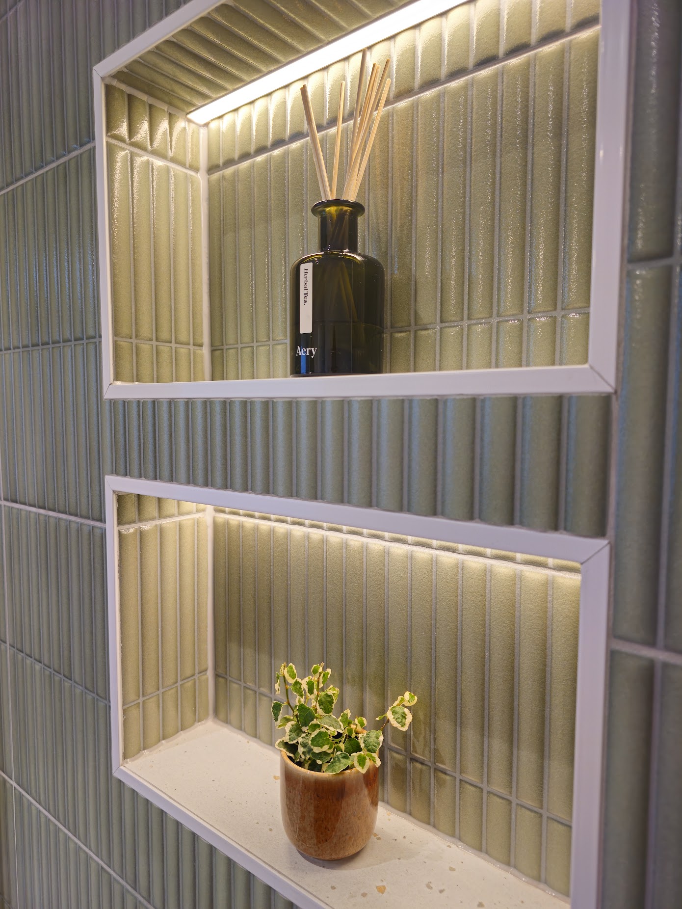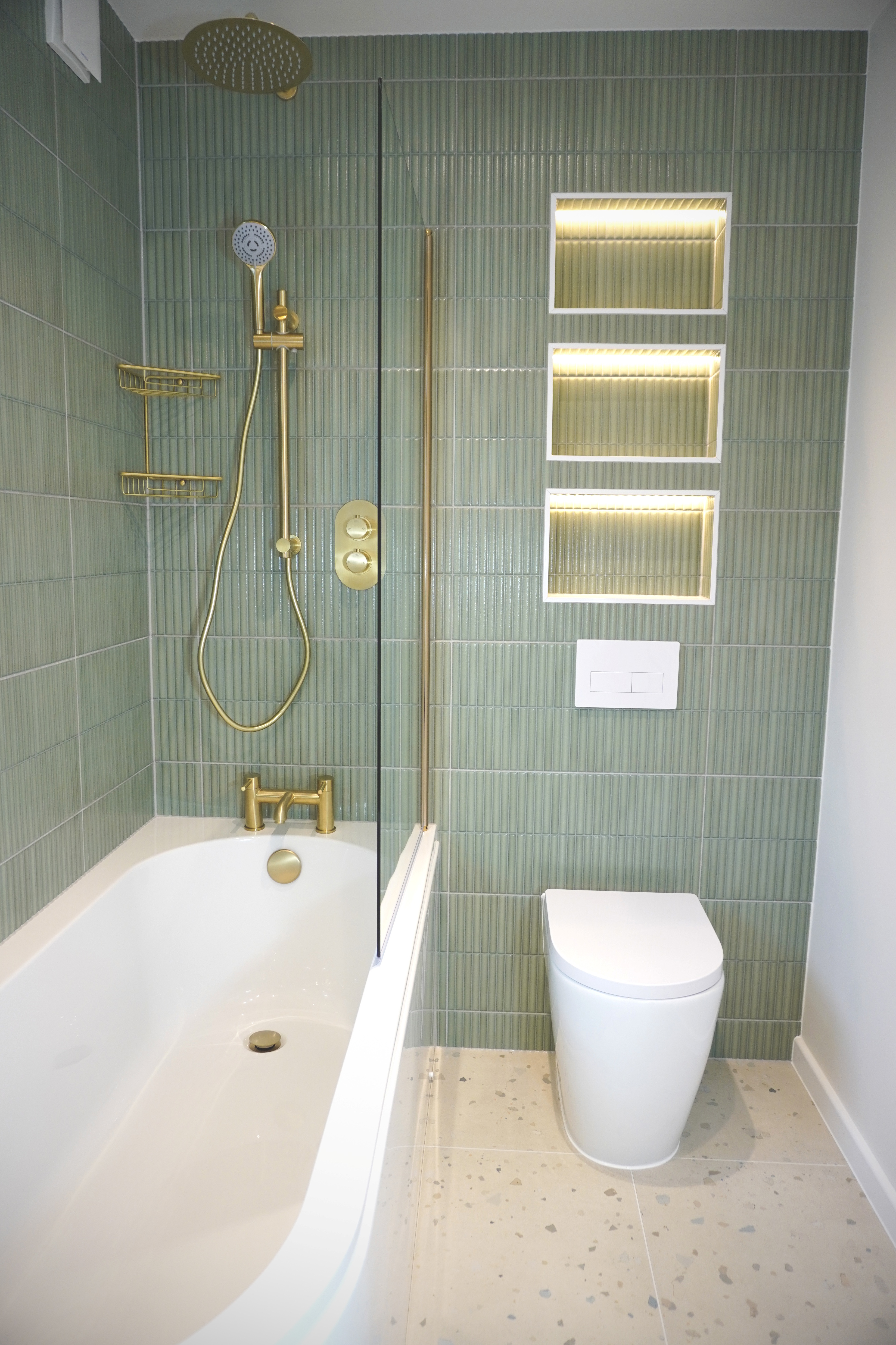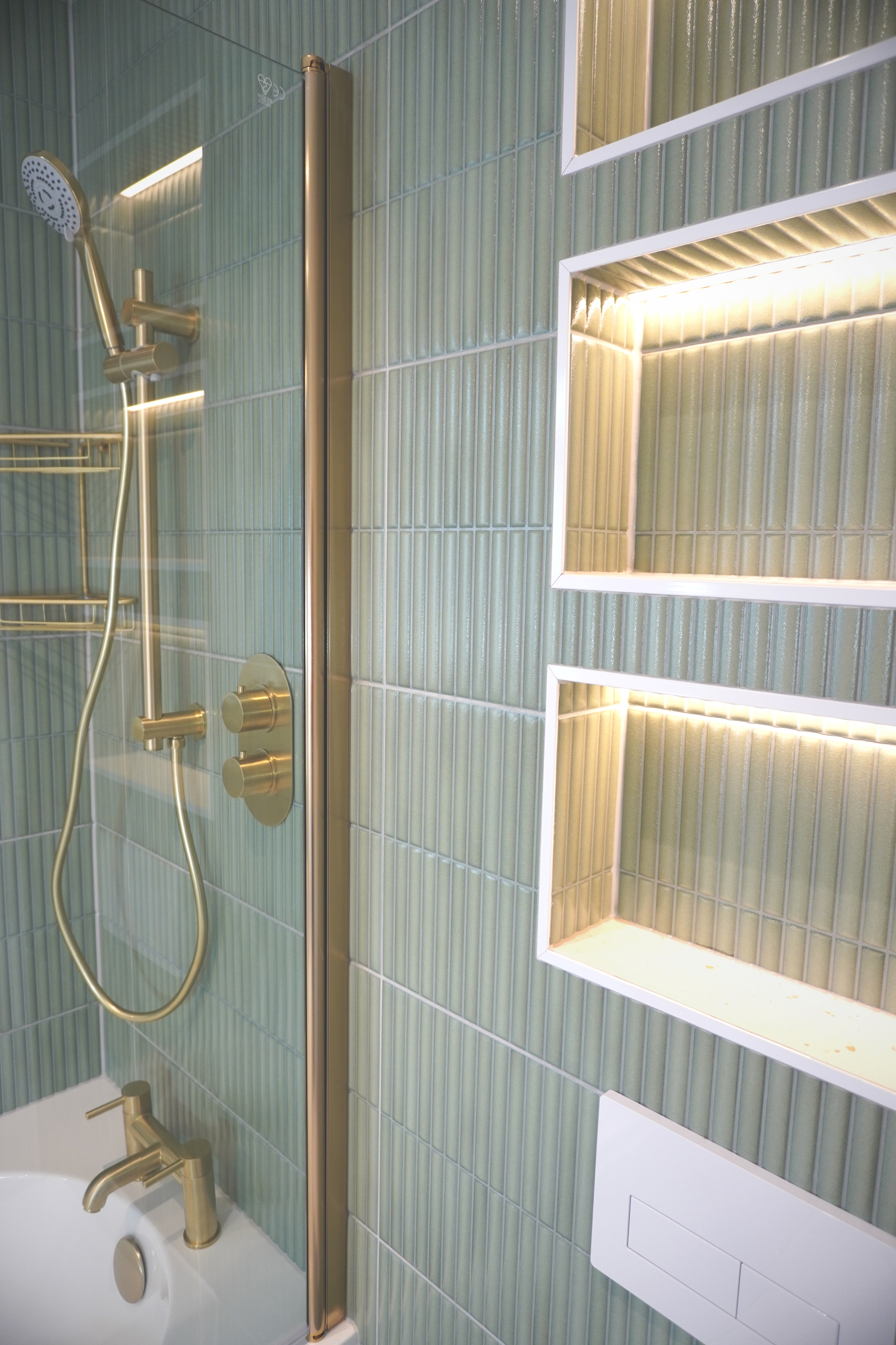 This renovation combined accessibility with style, creating a bathroom that’s both practical and beautiful. Key features include a flush, non-slip shower tray for wheelchair access, discreet grab rails, clever storage, and ambient lighting for comfort and safety. With glossy green tiles and thoughtful design throughout, the finished space is both contemporary and fully tailored to our client’s needs.