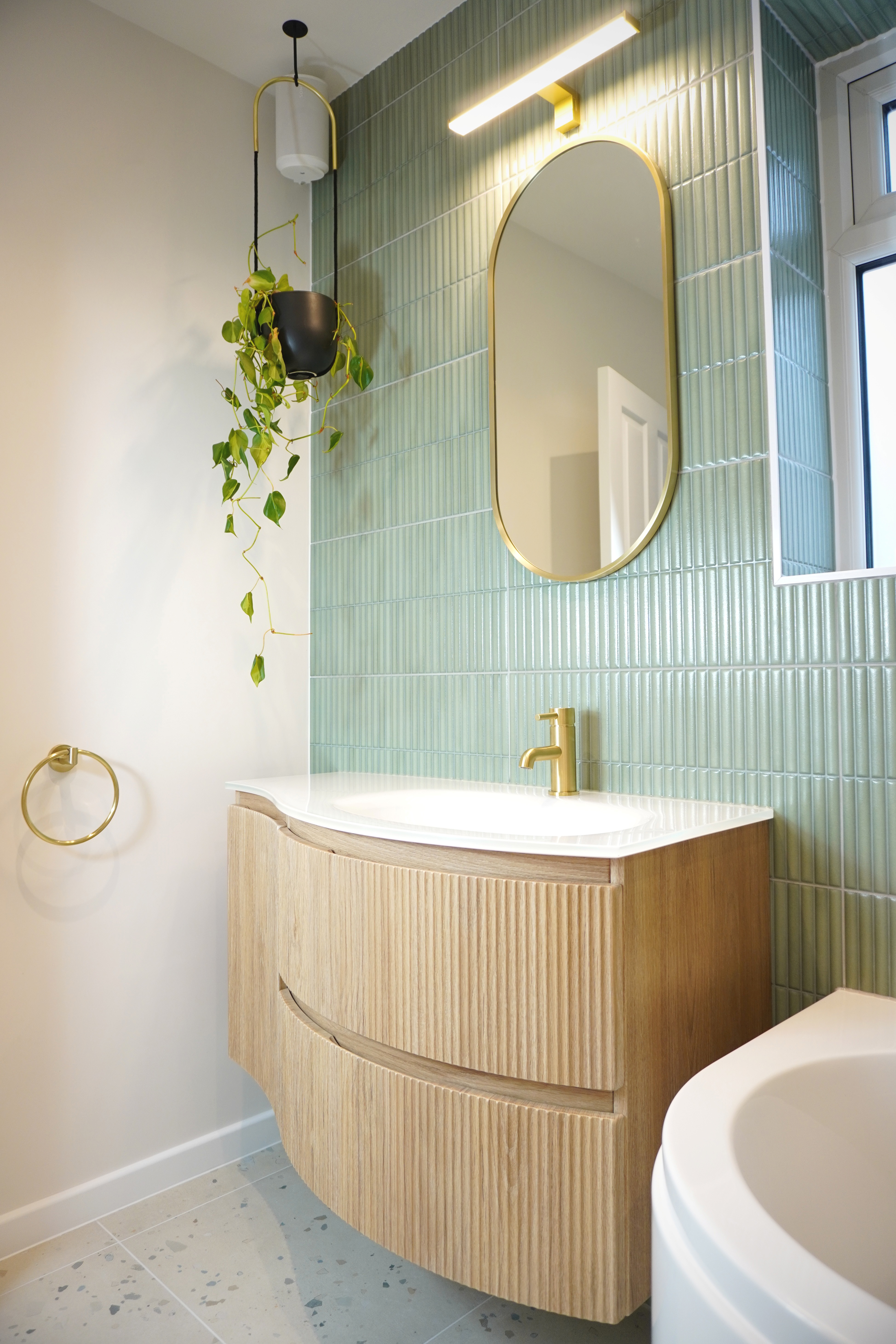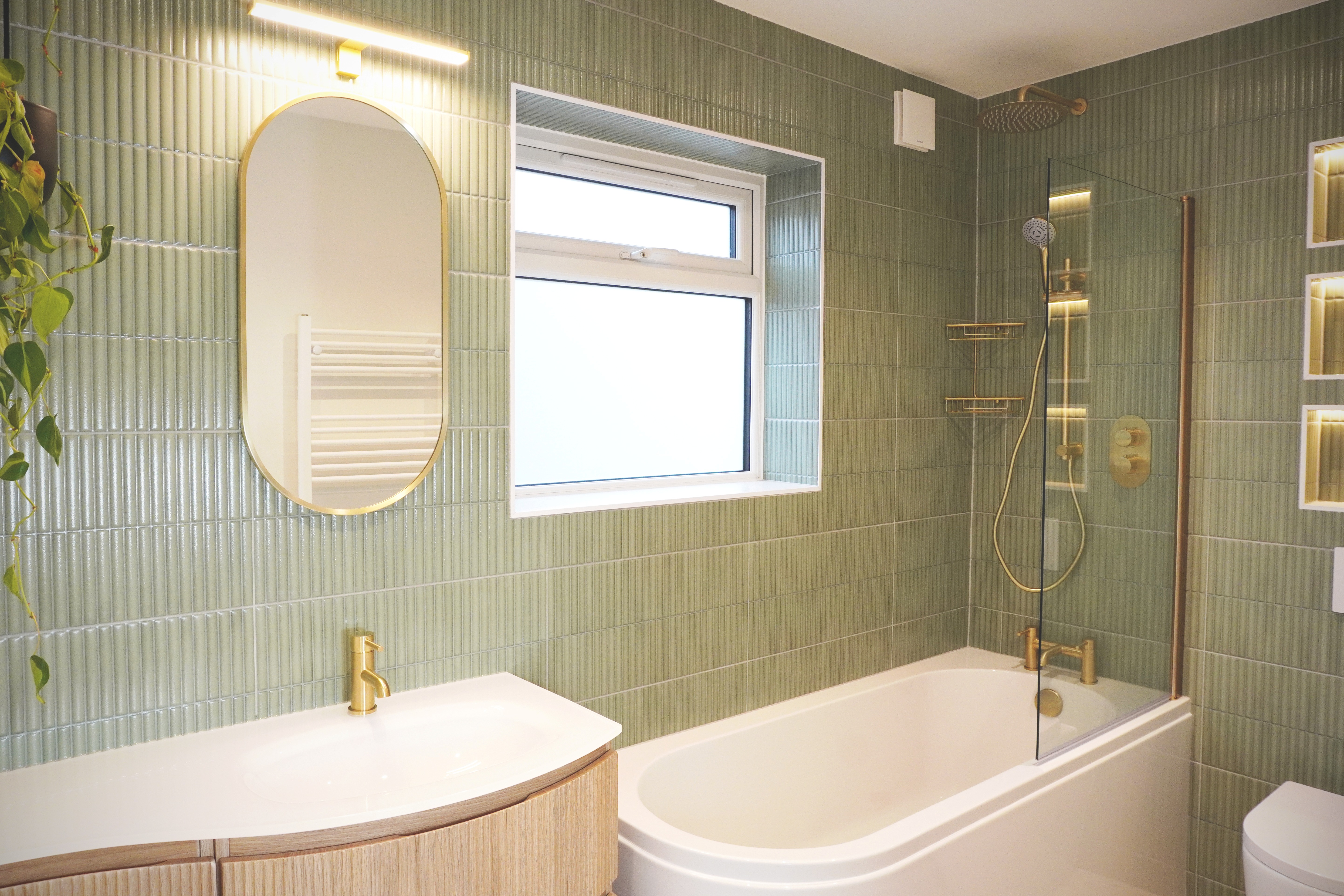 For this stunning bathroom renovation, we transformed two separate rooms into one spacious and contemporary family bathroom. By knocking down a dividing wall and boarding up an existing window, we created a bright, open layout that feels both functional and luxurious. The design features elegant green wall tiles, brushed brass fixtures, and a mix of natural wood and modern fittings for a warm yet sophisticated finish. Integrated lighting and sleek storage solutions complete the look, making this bathroom a stylish and practical retreat for the whole family.