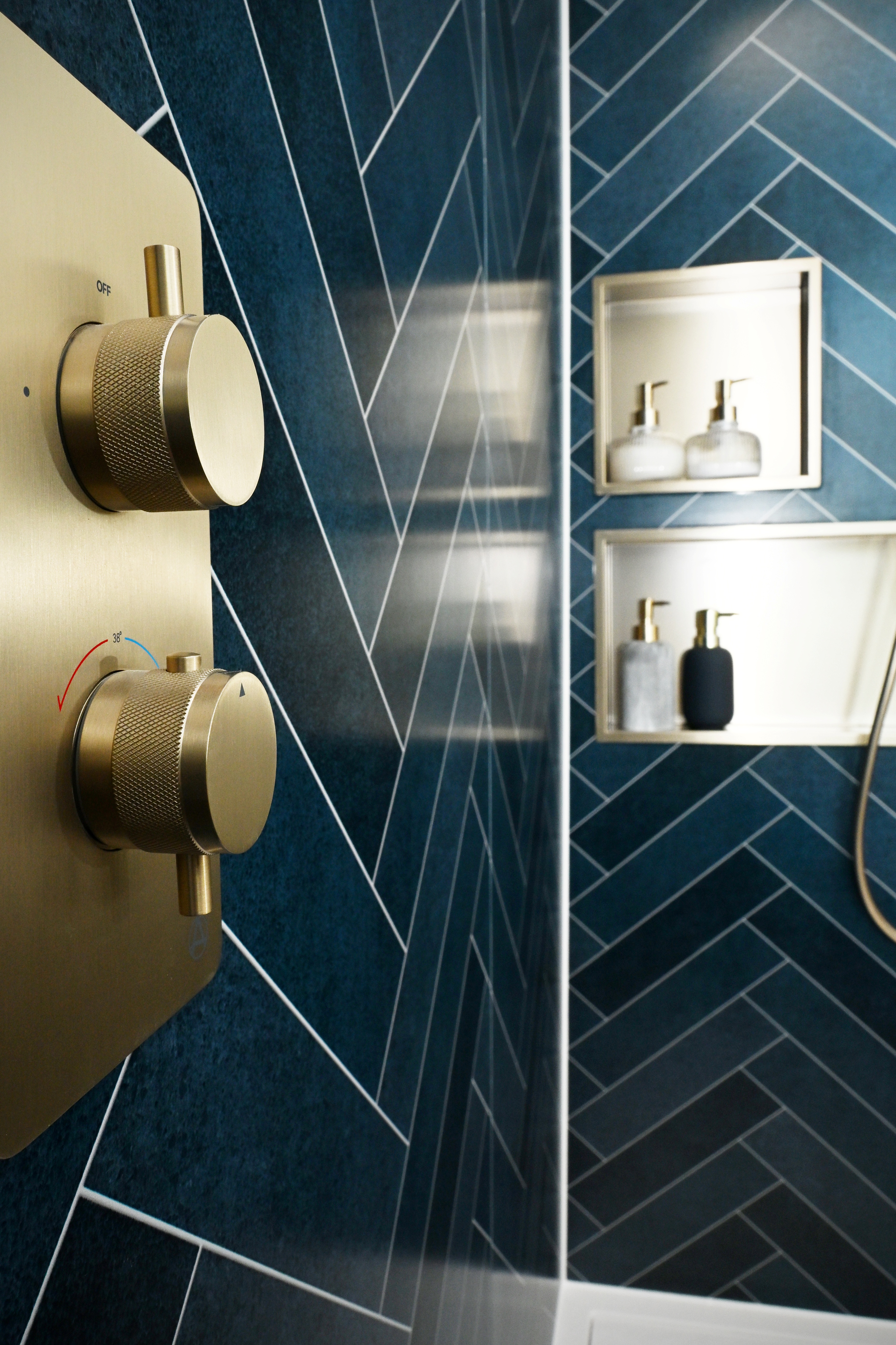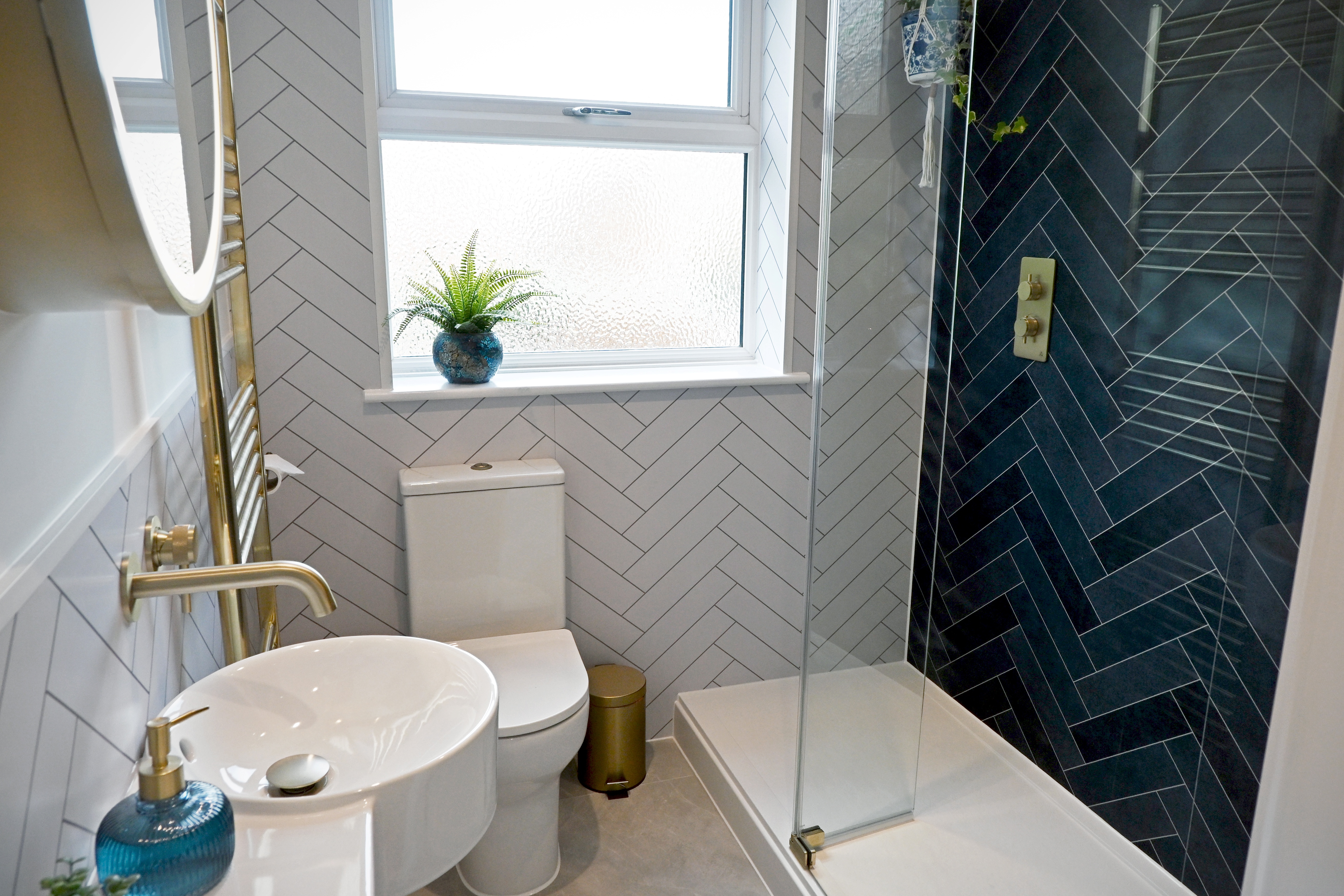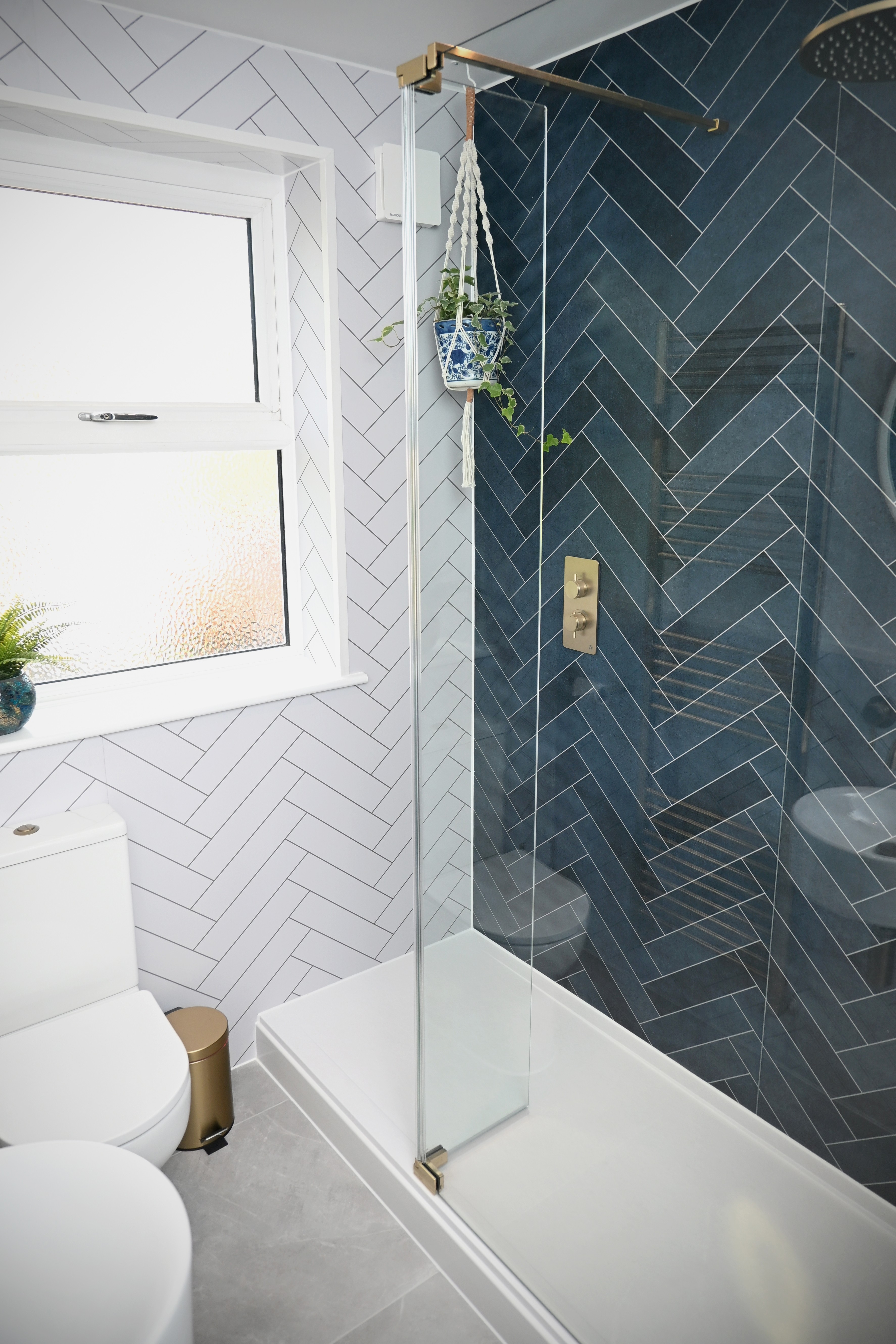 This compact bathroom was completely reimagined to create a brighter, more open space. We replaced the traditional bath with a sleek walk-in shower, featuring striking blue herringbone-effect panels as a bold focal point. A carefully planned rotating glass panel was added to the main shower screen, providing easy access without compromising the clean, minimal look. The toilet was repositioned for better flow and functionality, while the fresh light-toned walls and fittings enhance the feeling of space. Finishing touches in brushed brass and soft textures complete this modern, uplifting transformation.