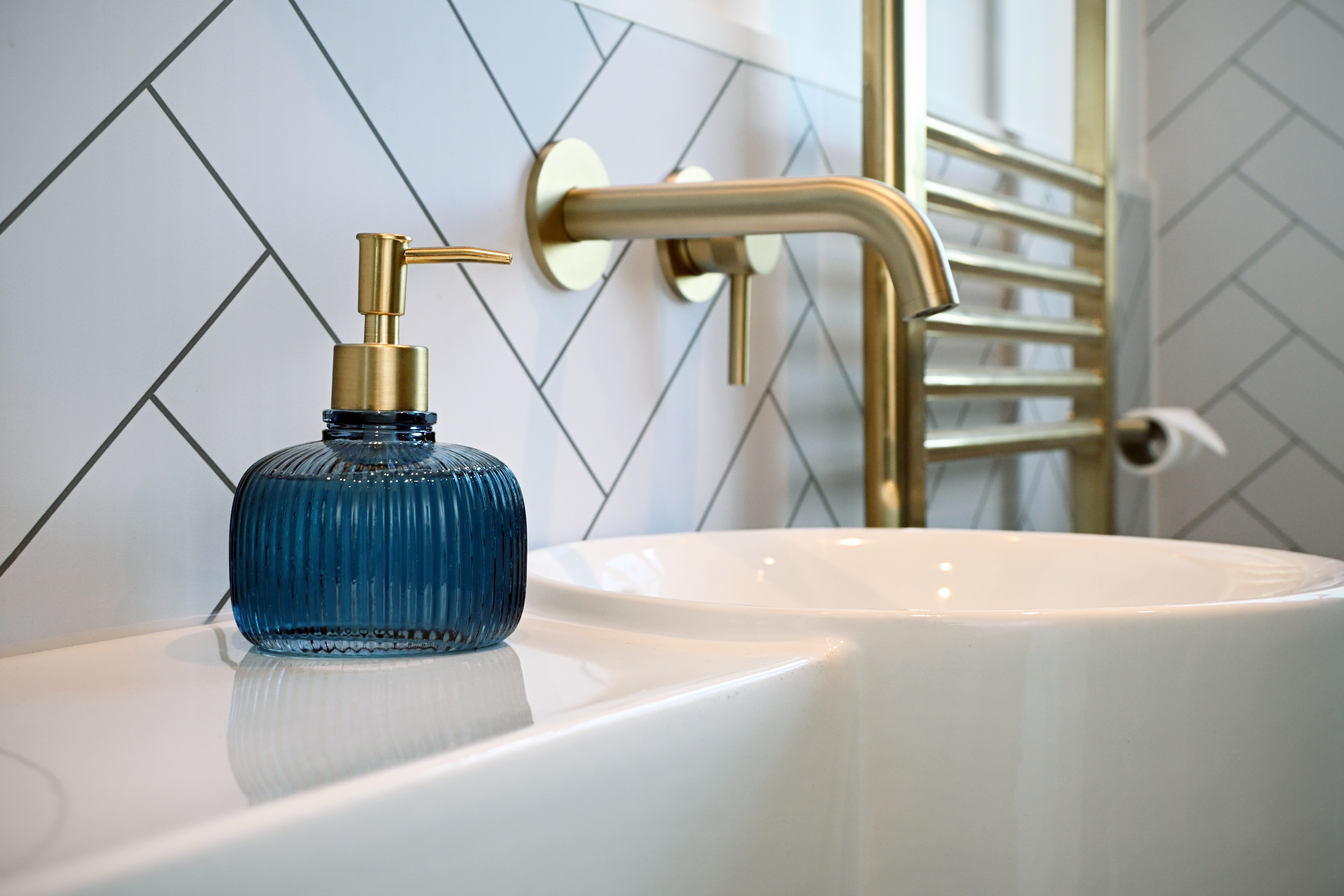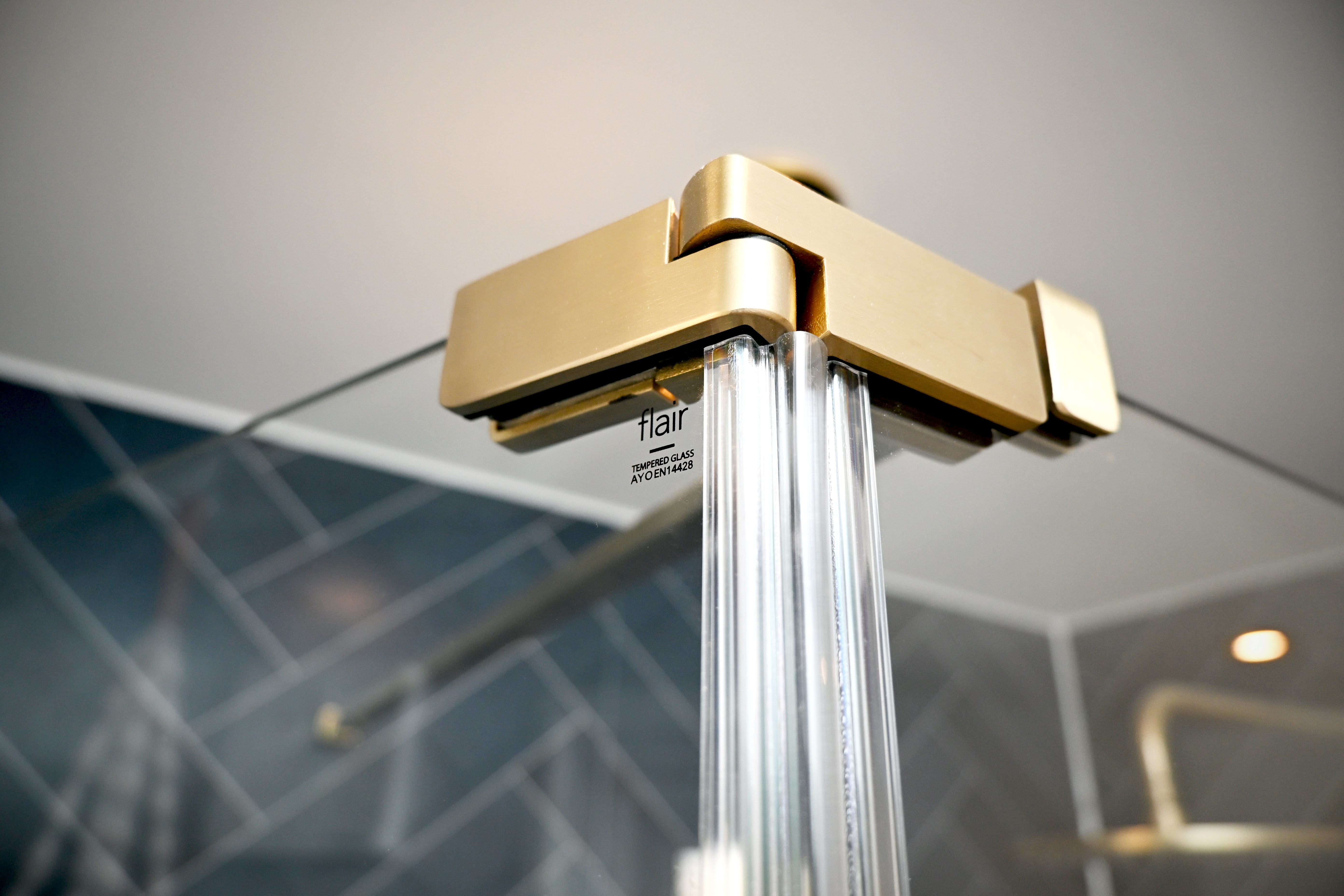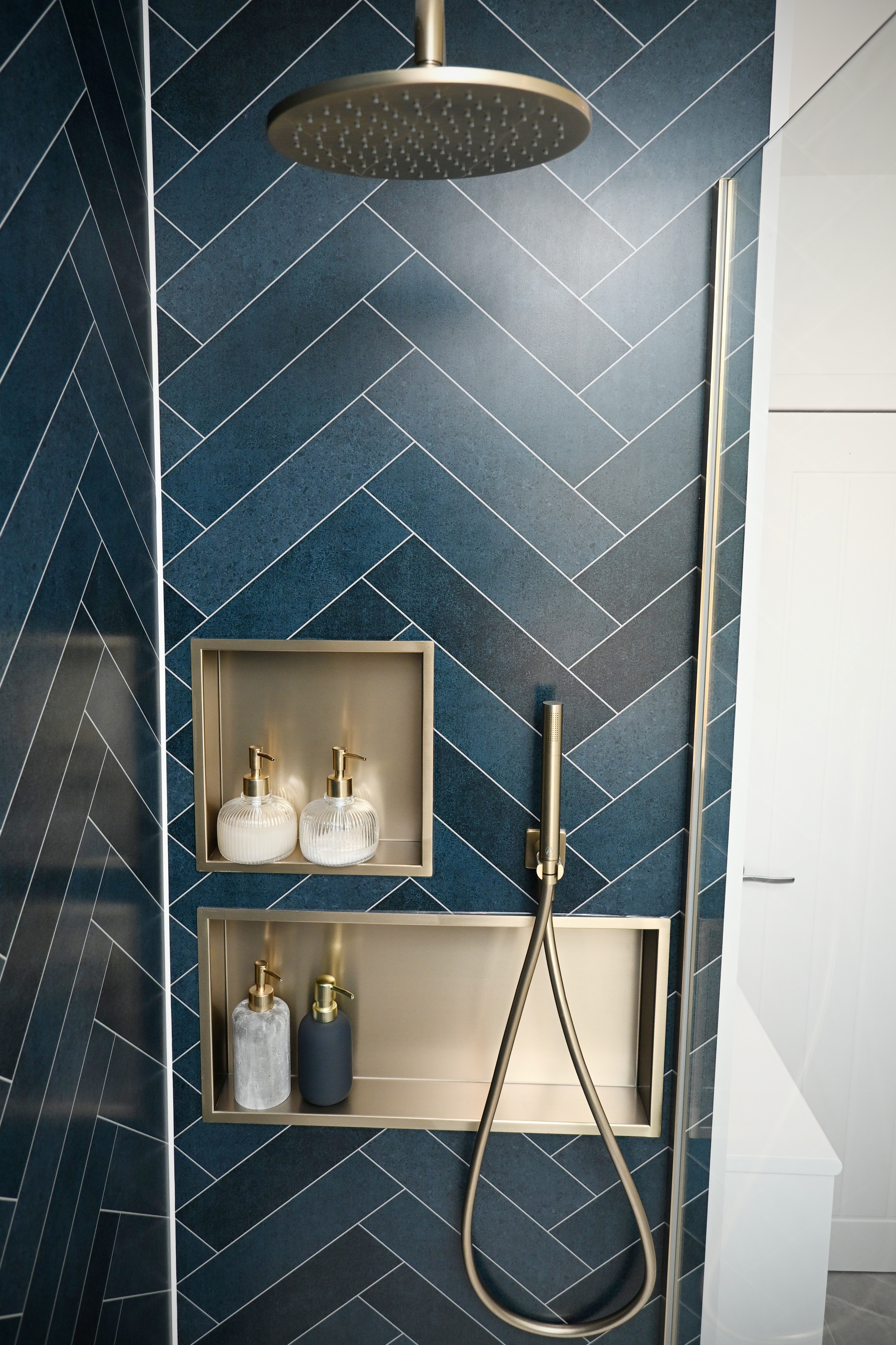 This compact bathroom was completely reimagined to create a brighter, more open space. We replaced the traditional bath with a sleek walk-in shower, featuring striking blue herringbone-effect panels as a bold focal point. A carefully planned rotating glass panel was added to the main shower screen, providing easy access without compromising the clean, minimal look. The toilet was repositioned for better flow and functionality, while the fresh light-toned walls and fittings enhance the feeling of space. Finishing touches in brushed brass and soft textures complete this modern, uplifting transformation.